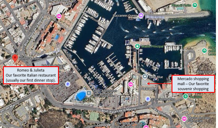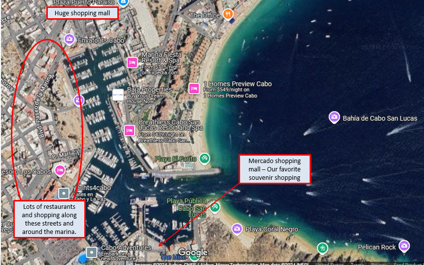 Cabo marina is a short 10 minute walk from the tender drop-off point. Lots of restaurants and shopping.