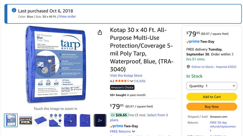 Tarp - Kotap 30-ft x 40-ft General Purpose Blue Poly Tarp - $46 on Amazon