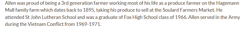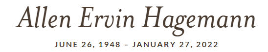 Allen Hagemann (June 26, 1948 - January 27, 2022) - Burial says "private", but could be at St. John's Lutheran Church