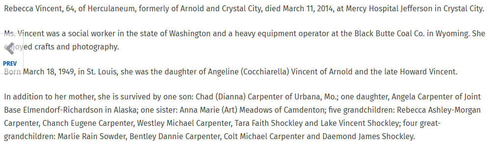 Rebecca (Vincent) Carpenter (March 18, 1949 - March 11, 2014)